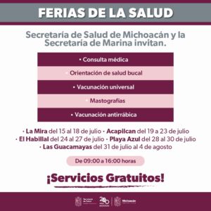 La Secretaría de Salud de Michoacán (SSM) y la Secretaría de Marina llevarán ferias de la salud a la población...