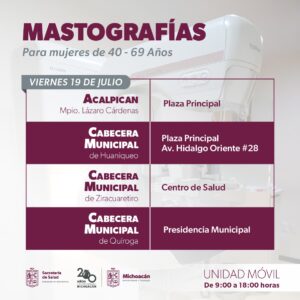La campaña itinerante de mastografías gratuitas de la Secretaría de Salud de Michoacán (SSM) avanza con éxito en la entidad....