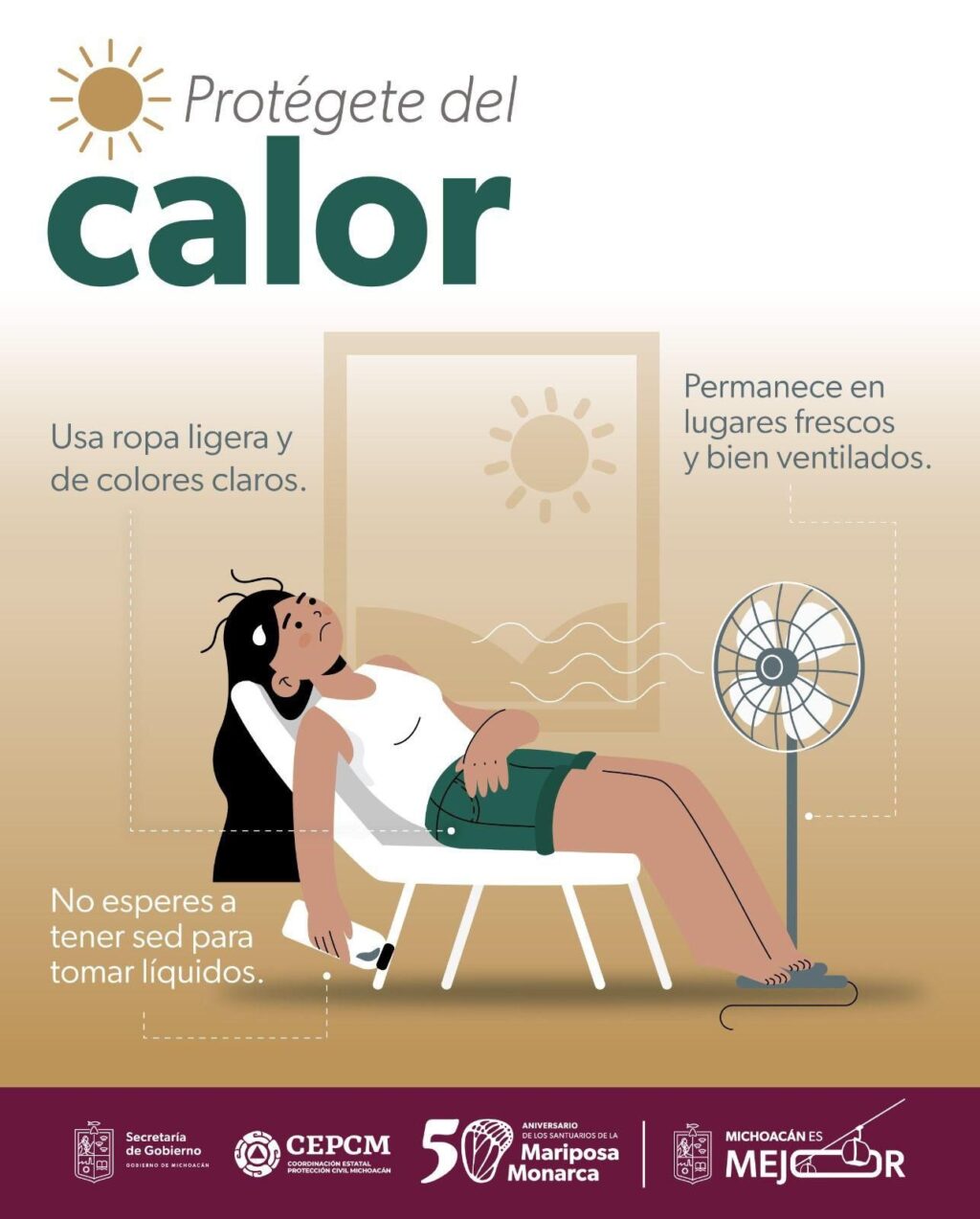 En este sentido Protección Civil exhorta a la población a extremar precauciones ante el riesgo de golpes de calor, cuyos síntomas incluyen mareos, dolor de cabeza y sudoración excesiva e invita a seguir las siguientes recomendaciones: