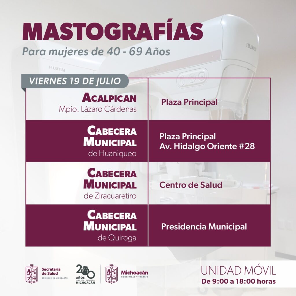 La campaña itinerante de mastografías gratuitas de la Secretaría de Salud de Michoacán (SSM) avanza con éxito en la entidad. Del 15 al 19 de julio se efectuarán servicios gratuitos en 10 municipios de la entidad.