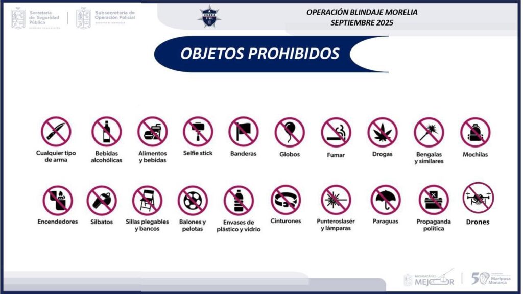Morelia, Michoacán, 13 de septiembre de 2025.- Para garantizar el orden y la seguridad en las fiestas patrias, la Secretaría de Seguridad Pública (SSP) da a conocer la lista de objetos cuyo ingreso no estará permitido al primer cuadro del Centro de Morelia.