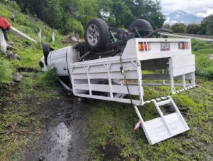 Una camioneta de redilas se salió de la cinta asfáltica y acabó con volcada en un predio a un costado...