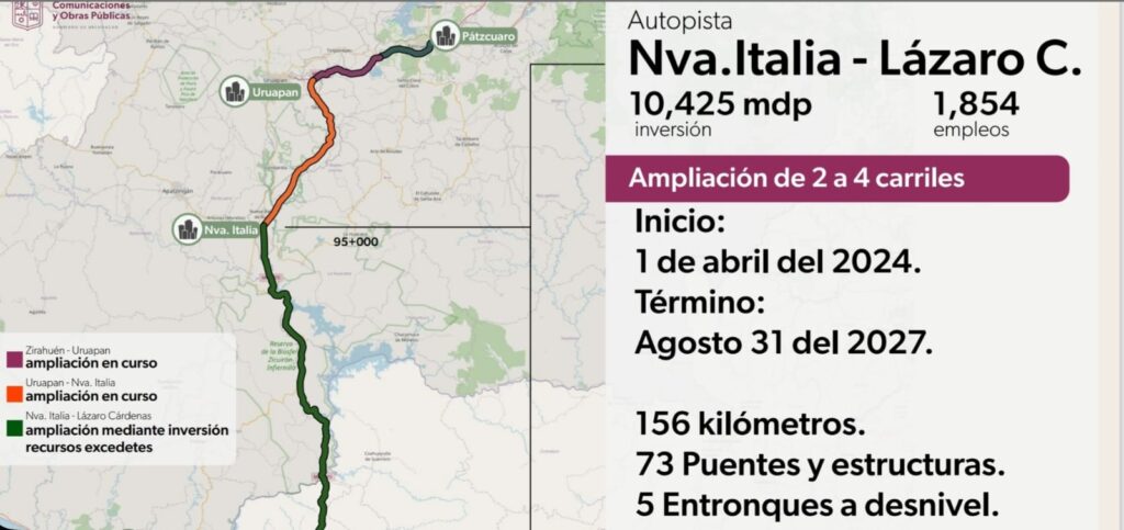 El trayecto Taretan-Uruapan-Nueva Italia está contemplado para terminar para el 2027. Mientras tanto, el tramo Nueva Italia-Lázaro Cárdenas será para antes de que concluya la actual gestión estatal.