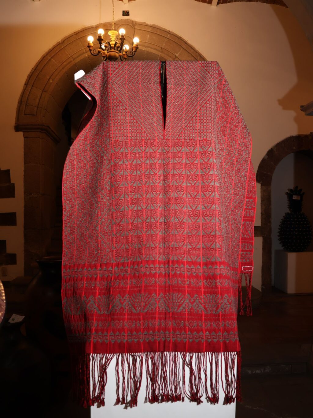 Otro de los premios principales, el galardón Occidente, fue para un gabán en telar de cintura de lana y algodón rojo con gris que elaboro la maestra artesana Angela Perucho Amado de la localidad de Angahuan.