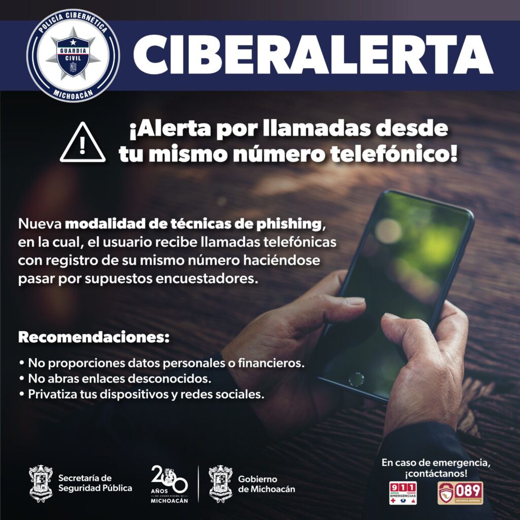 La Secretaría de Seguridad Pública (SSP), a través de la Subdirección de Policía Cibernética, alerta a usuarios de telefonía móvil sobre una nueva modalidad de suplantación de identidad o phishing, donde pueden recibir llamadas registradas como su mismo número, haciéndose pasar por supuestos encuestadores y solicitando información personal.