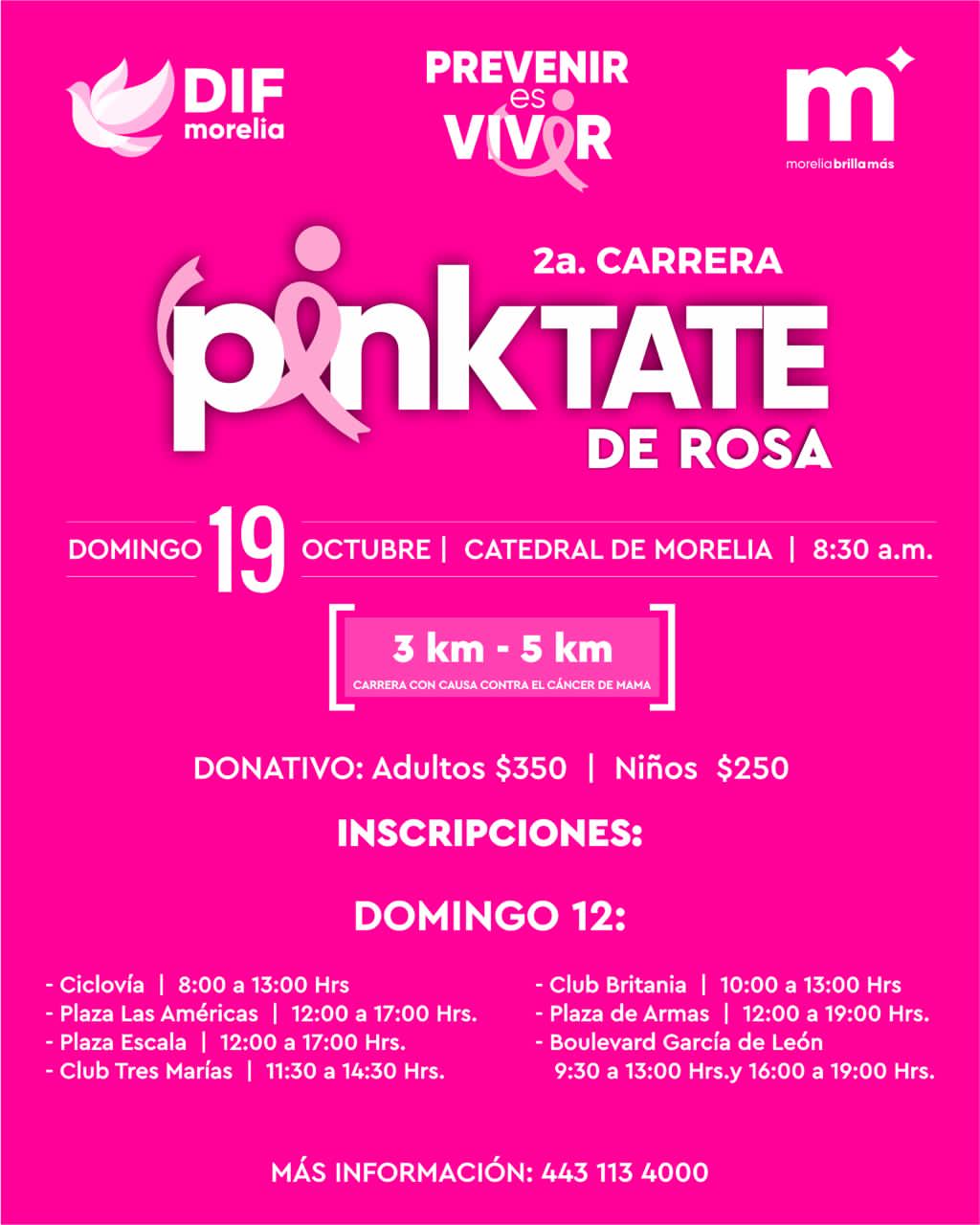 El donativo es de 350 pesos para adultos y 250 para niñas y niños menores de 12 años, e incluye playera conmemorativa, número de participante, hidratación y medalla al finalizar. Quienes prefieran hacerlo directamente pueden acudir a las oficinas centrales del DIF Morelia (Vicente Barroso de La Escayola No. 135, Col. La Estrella) o al Centro Administrativo Morelia (CAM) (Eduardo Ruiz No. 570, Col. Centro Histórico) en horario de oficina de lunes a viernes.