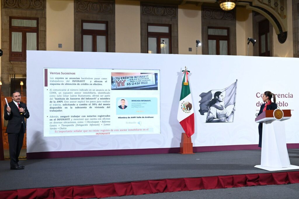 Finalmente, hizo un llamado a las personas derechohabientes del INFONAVIT a no dejarse engañar por “coyotes” quienes les hacen creer que podrán sacar en efectivo el dinero que tienen ahorrado en el Instituto, a cambio de una comisión de más del 40% de los recursos. Como ejemplo, presentó la grabación de una llamada telefónica de este tipo de fraudes.