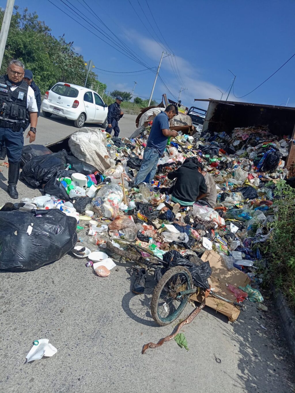 Afortunadamente un elemento a bordo de una motocicleta del escuadrón de Seguridad Vial pasó por el lugar y al percatarse que estaba una persona atrapada entre la basura, de inmediato empezó a mover los desperdicios para sacar al joven que ya no respiraba.