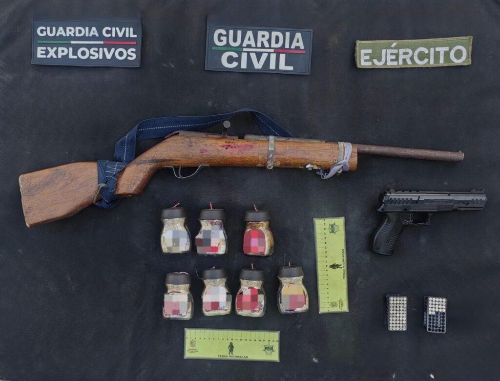 Resultado de la Operación Apatzingán, agentes de las secretarías de Seguridad Pública (SSP) y de la Defensa Nacional (Defensa) detuvieron a un hombre en posesión de un arma de fuego y una réplica, así como cartuchos útiles y siete artefactos explosivos de fabricación casera.