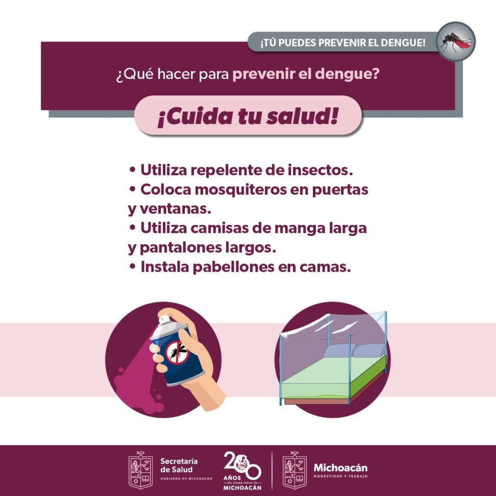 Otras medidas para prevenir el dengue, zika y chikungunya incluyen el uso de repelente, vestir ropa clara, instalar mosquiteros en puertas y ventanas, usar pabellones para dormir y mantener patios, azoteas y jardines limpios y libres de cacharros.
