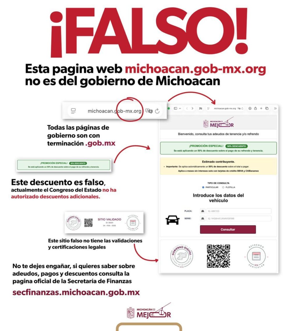 Ante el incremento de páginas que en redes sociales ofrecen descuentos y promociones en refrendos, licencias de conducir y diversos trámites vehiculares, la Secretaría de Finanzas y Administración, a través del Servicio de Administración Tributaria de Michoacán (Satmich), alerta a la población para que no se víctima de engaños y fraudes.