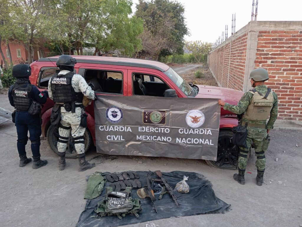 Al verse superados, los gatilleros huyeron hacía una barranca, dejando abandonada una camioneta de la marca Dodge Nitro de color guinda, dos fusiles calibre 7.62 X 39, 300 cartuchos útiles, 12 cargadores y un chaleco porta placas, con el logotipo del citado grupo criminal.