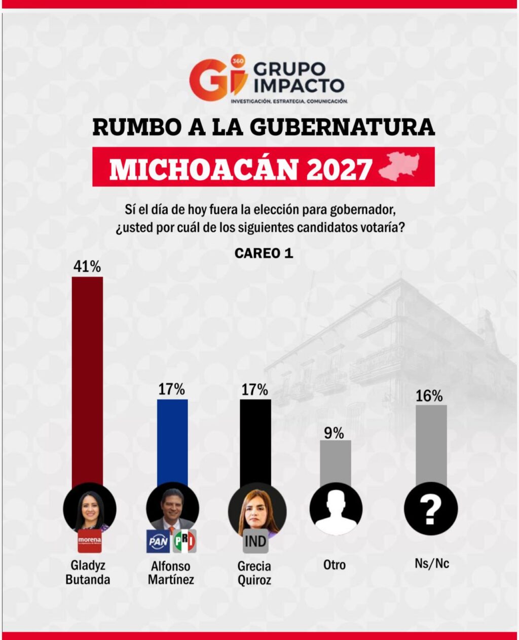 De presentarse este escenario, Gladyz Butanda se convertiría en la sucesora de Alfredo Ramírez Bedolla, tomando en cuenta que Morena suma 52 puntos en las preferencias electorales frente a una endeble oposición que suma en su conjunto apenas 28 puntos: el PAN 17, el PRI 7 y Movimiento Ciudado sólo cuatro puntos.