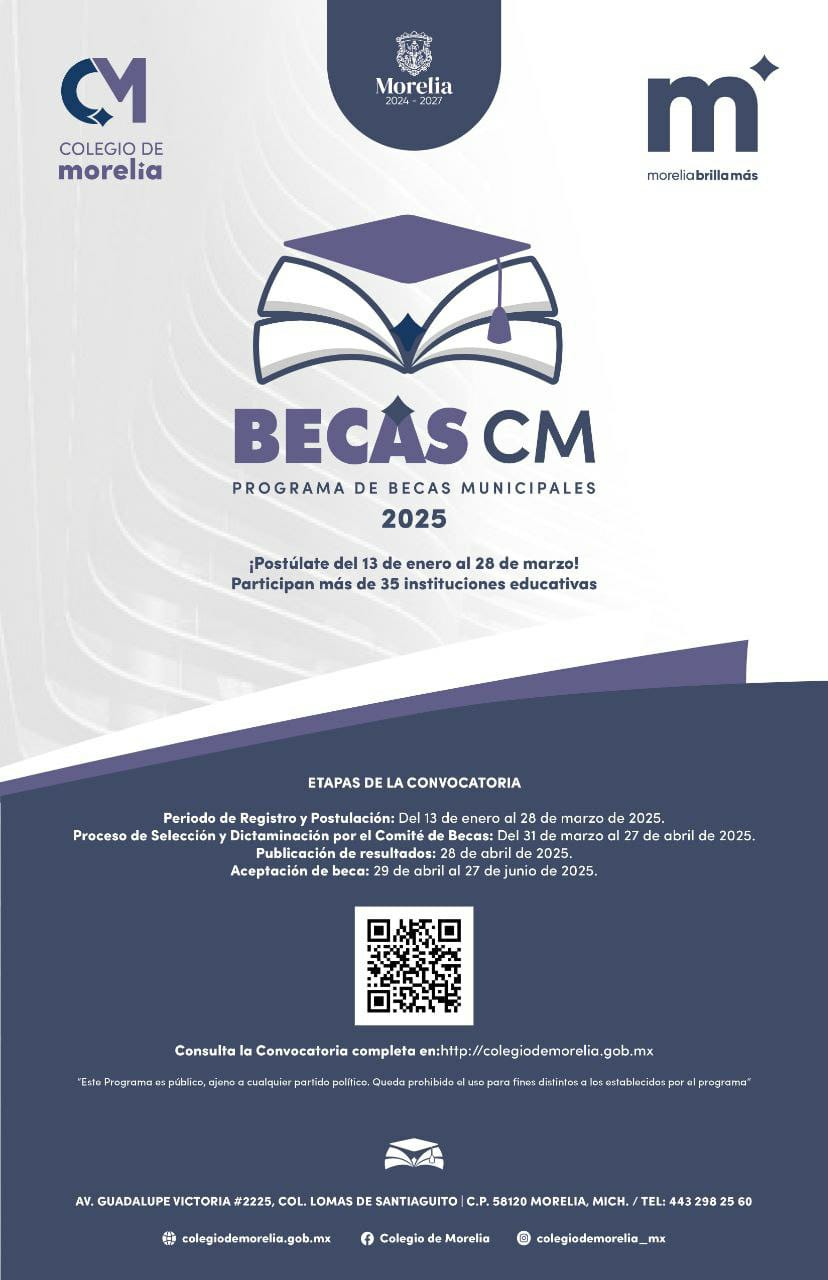 El Colegio de Morelia anunció la convocatoria para el Programa de Becas 2025 que el Gobierno encabezado por el Presidente Municipal, Alfonso Martínez Alcázar, otorga en favor de la población estudiantil local.