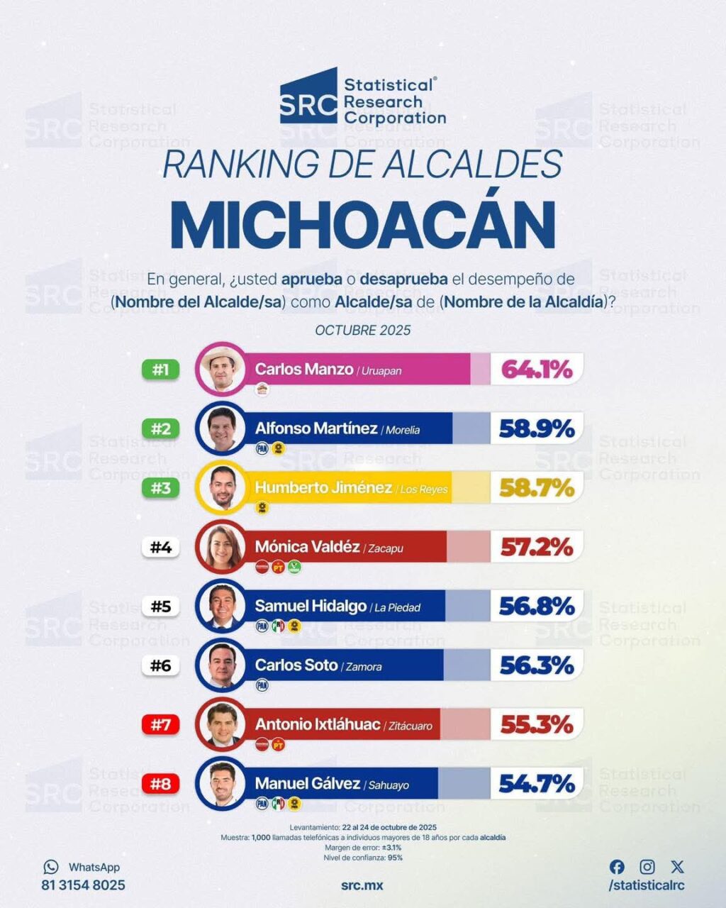La empresa Statistical Research Corporation (SRC) dio a conocer el ranking de alcaldes con mayor aprobación en Michoacán durante el mes de octubre de este 2025, en donde sobresale el nombre de Humberto Jiménez Solís, presidente municipal de Los Reyes, en tercer lugar.