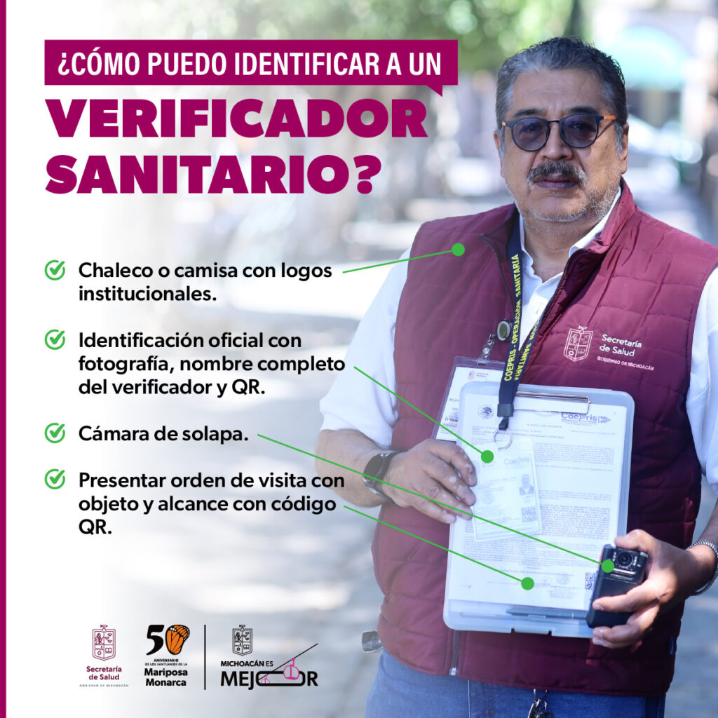 La Comisión Estatal para la Protección contra Riesgos Sanitarios de Michoacán (Coepris) informa a la población y a los establecimientos comerciales sobre cómo identificar correctamente a las o los verificadores sanitarios autorizados, con el objetivo de prevenir fraudes y evitar caer en manos de falsos inspectores.
