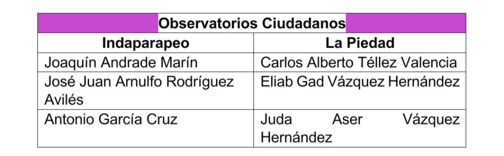 Con el objetivo de fortalecer la participación ciudadana y fomentar la vigilancia democrática en el ámbito municipal, el Instituto Electoral de Michoacán (IEM) llevó a cabo la instalación de los Observatorios Ciudadanos de los Ayuntamientos de La Piedad e Indaparapeo.