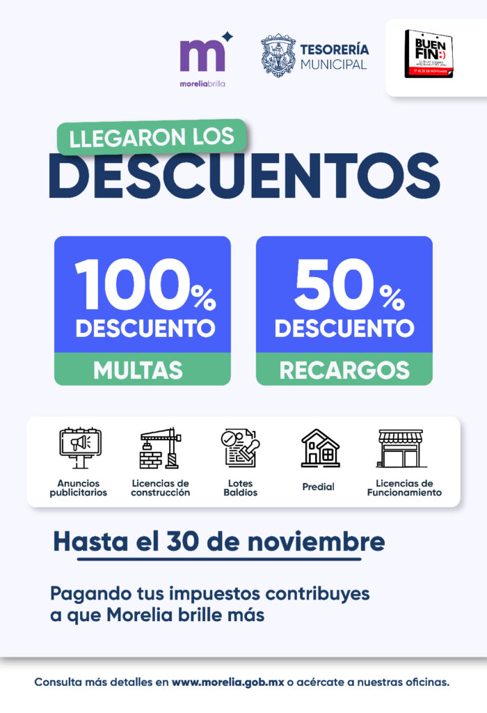 El Ayuntamiento de Morelia se subió a las promociones y descuentos de El Buen Fin en todas las contribuciones y derechos, para que las y los morelianos se pongan al corriente en sus pagos; de lo contrario, las deudas se convertirán en una «bola de nieve». Se estiman recaudar entre 80 y 90 millones de pesos en este mes.