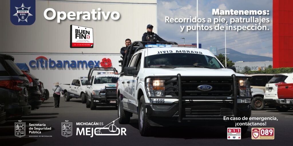 Con motivo del Buen Fin 2025, la Secretaría de Seguridad Pública (SSP) ha desplegado un dispositivo integral de seguridad, prevención y vigilancia en toda la entidad. Este operativo se realiza en el marco del fin de semana de mayores ofertas comerciales del año.