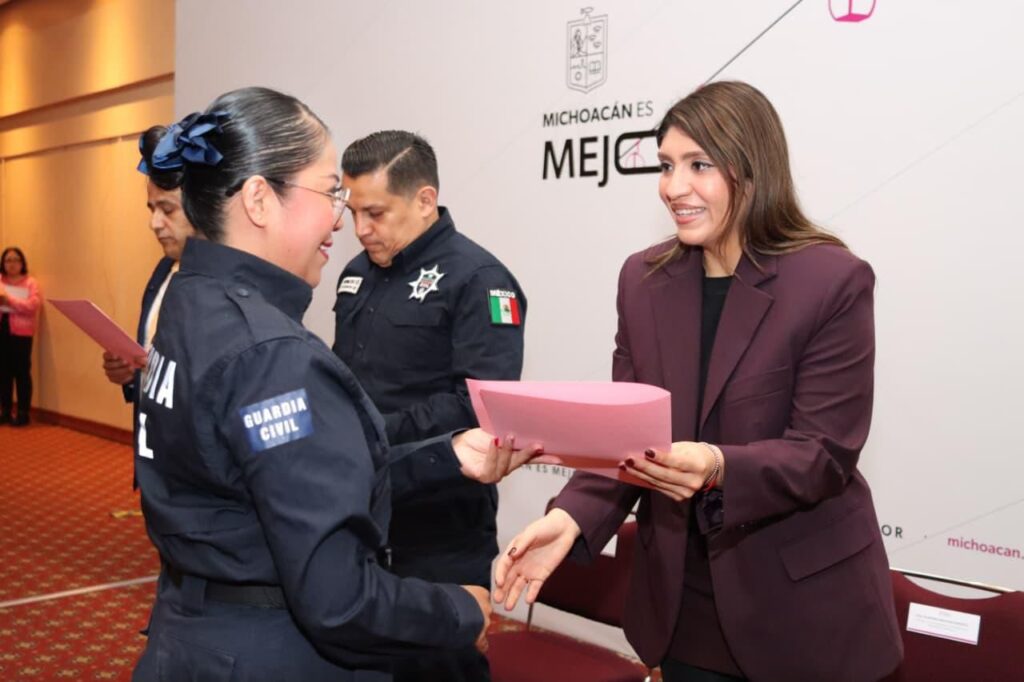 La secretaria de Igualdad Sustantiva y Desarrollo de las Mujeres Michoacanas, Alejandra Anguiano González, en coordinación con el secretario de Seguridad Pública, José Antonio Cruz Medina y la Policía Auxiliar, realizó la clausura del Curso Especializado en Materia de Primer Respondiente con Perspectiva de Género, en donde participaron 2 mil 134 personas servidoras públicas.