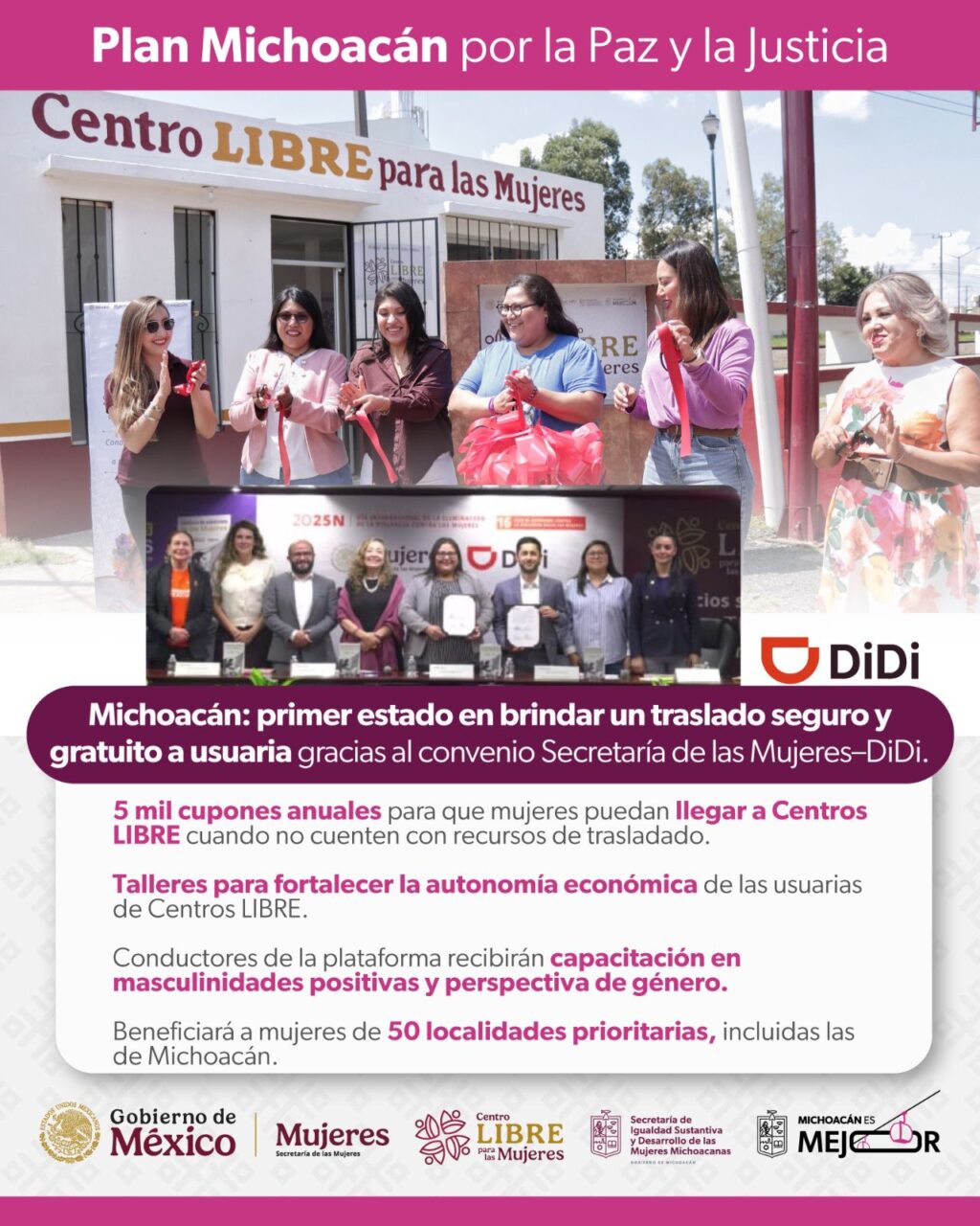 Dicho acuerdo contempla la entrega anual de cupones de movilidad para mujeres usuarias de los Centros LIBRE y otros espacios de atención, en estados prioritarios como Michoacán, Querétaro y Tamaulipas. Esta acción forma parte de una estrategia nacional para integrar la perspectiva de género en la movilidad digital, reducir riesgos durante los traslados y facilitar el acceso a servicios de apoyo.