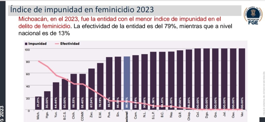 El estado de Michoacán se colocó en la primera posición nacional del indicador de efectividad en procesos de justicia del delito de feminicidio en la evaluación publicada en la última edición del estudio Hallazgos 2023.