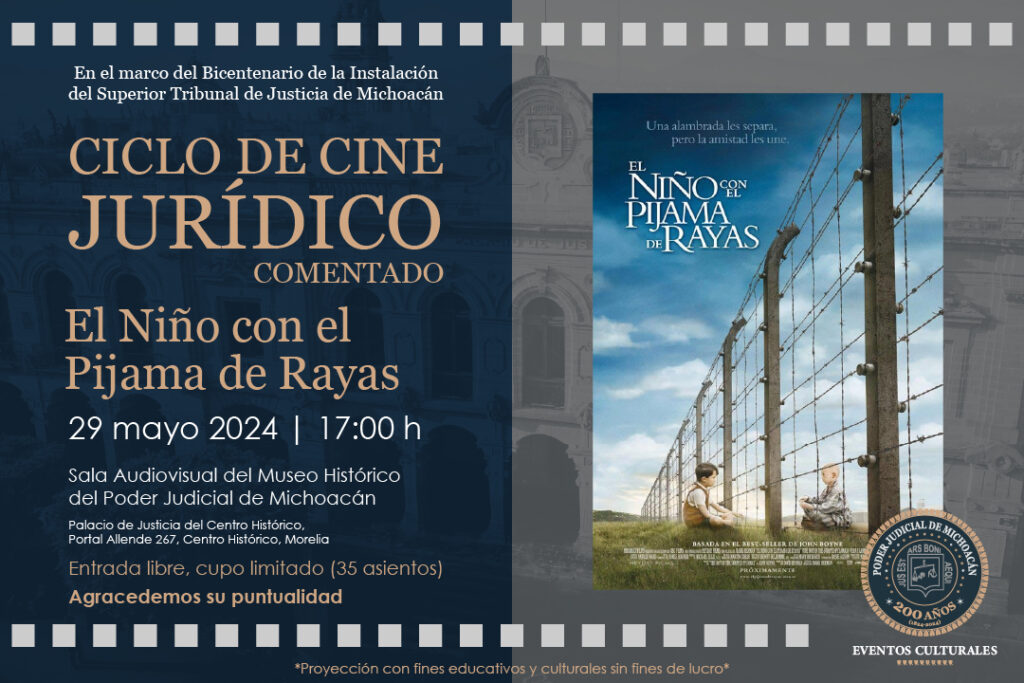 El 29 de mayo a las 17:00 h se realizará el ciclo de cine jurídico con la proyección de la película El niño con el pijama de rayas en la sala audiovisual del Museo Histórico. La entrada es libre con cupo limitado, por lo que es importante ser puntuales para asegurar su lugar.