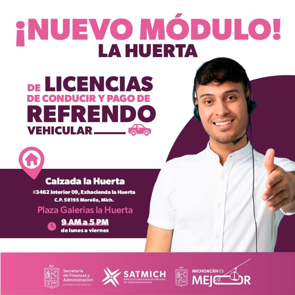 En su interés de ofrecer mayor atención, comodidad y servicio a la ciudadanía, la Secretaría de Finanzas y Administración, a través del Servicio de Administración Tributaria de Michoacán (Satmich), instaló una oficina de Recaudación en Plaza Galerías La Huerta, donde las personas tendrán oportunidad de tramitar sus licencias de conducir y pagar refrendos vehiculares, anunció el tesorero estatal, Luis Navarro.