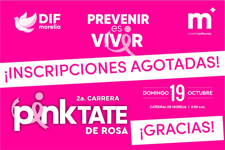 La presidenta honoraria del DIF Morelia, Paola Delgadillo Hernández, anunció que las inscripciones para la Segunda Carrera Atlética “Pinktate de Rosa” han quedado agotadas, gracias a la entusiasta respuesta de la ciudadanía que se ha sumado a esta causa solidaria en apoyo a mujeres que han superado o enfrentan el cáncer de mama.