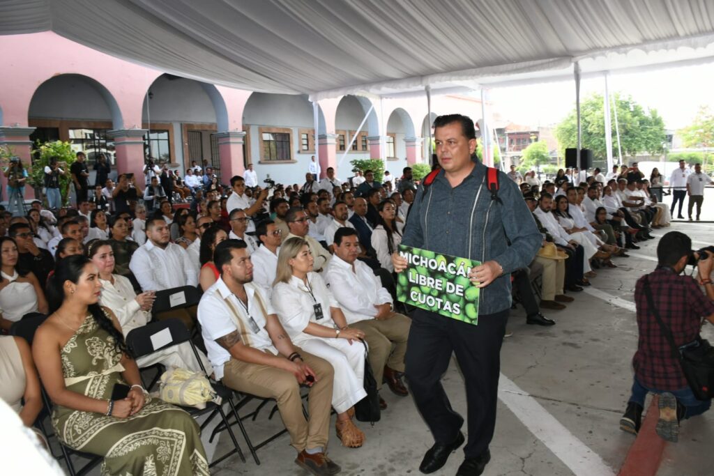 El legislador tricolor que portaba una pancarta con la leyenda “Michoacán libre de cuotas”, en alusión a las extorsiones contra los productores de limón, se levantó de la curul y se retiró de la sesión, en la cual estuvo presente el gobernador michoacano, Alfredo Ramírez Bedolla.