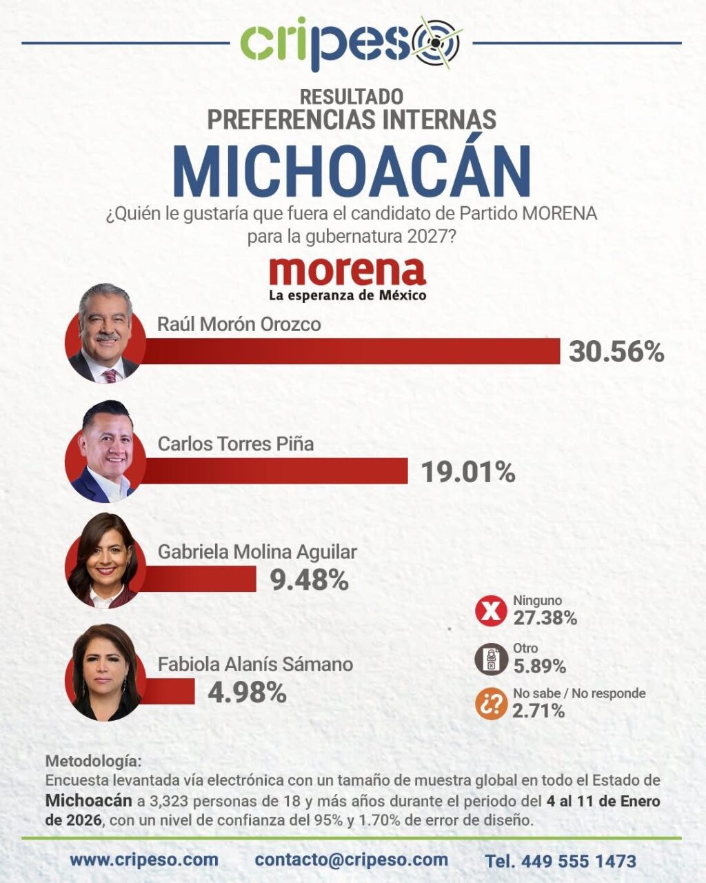 En el estudio de preferencias internas, Morón Orozco encabeza la lista con un sólido 30.56%, superando de manera significativa a otros perfiles del partido como Carlos Torres Piña (19.01%), Gabriela Molina Aguilar (9.48%) y Fabiola Alanís Sámano (4.98%).