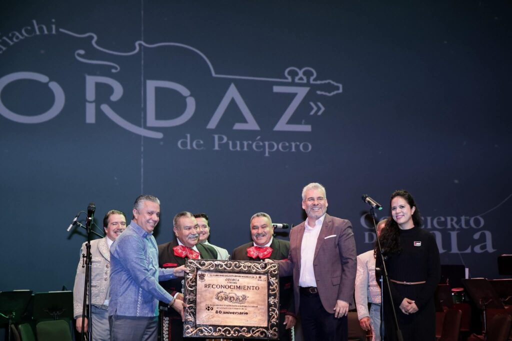 En el marco de las fiestas patrias, Luis Navarro García reconoció la trayectoria de 80 años del Mariachi Ordaz, en una presentación que tuvo junto con la Orquesta Sinfónica de Michoacán.