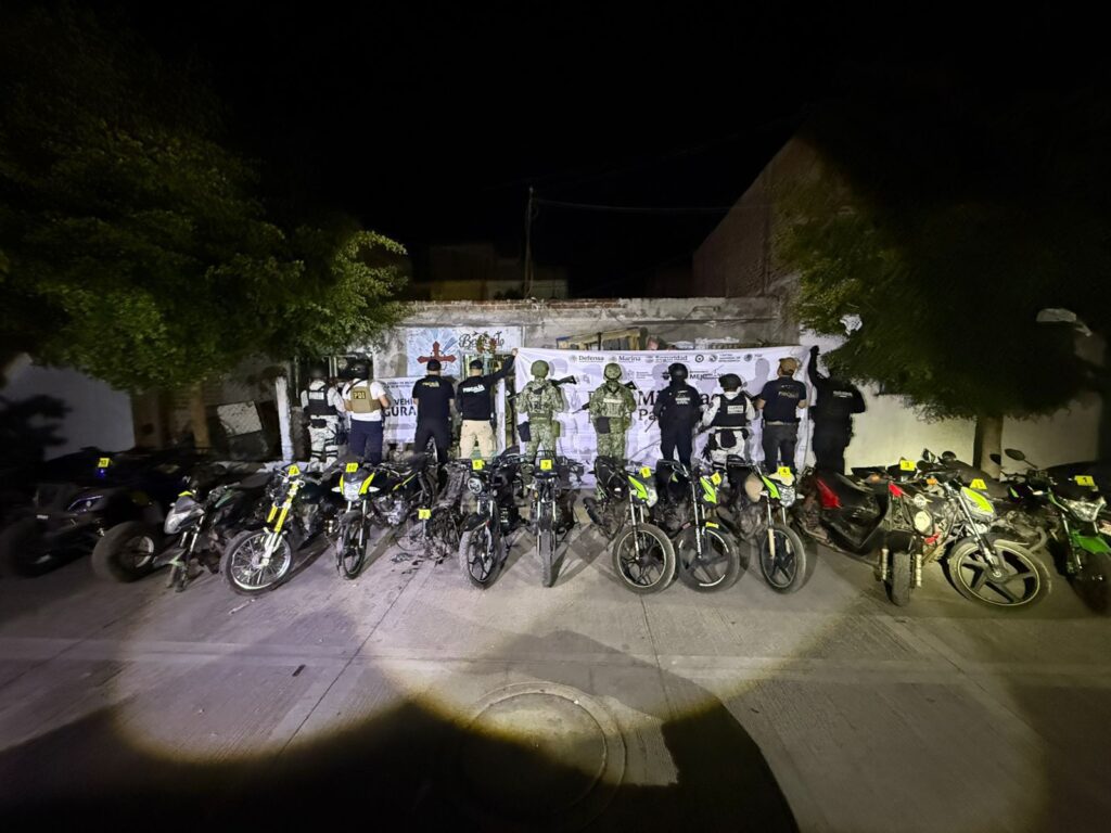 En una acción interinstitucional, elementos de las secretarías de Seguridad Pública (SSP) y de la Defensa Nacional (Defensa), así como la Guardia Nacional (GN), dieron acompañamiento a una orden de cateo que cumplimentó la Fiscalía General del Estado (FGE) en un inmueble en Jacona, donde se recuperaron 11 motocicletas robadas.