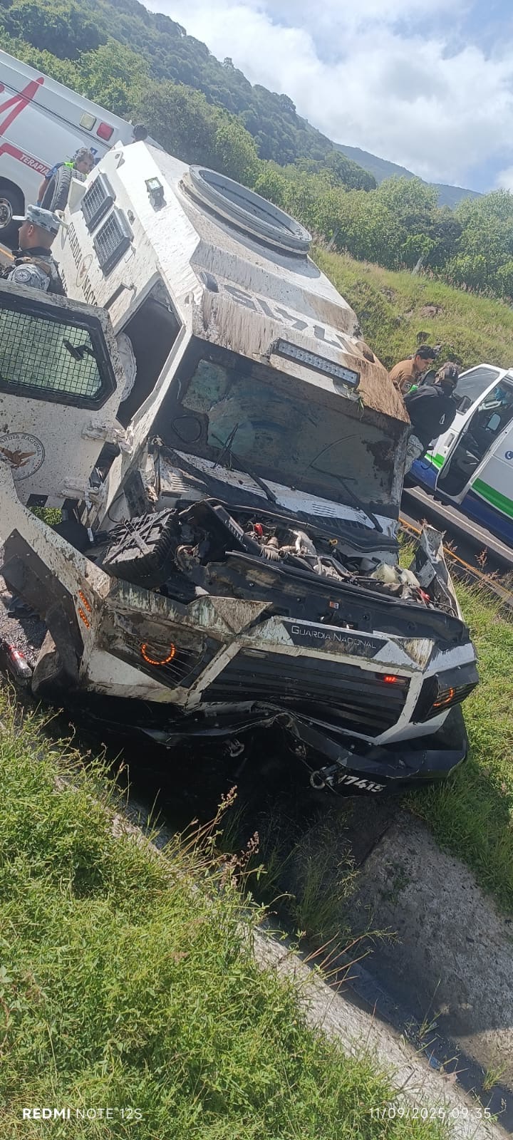 Panindícuaro, Mich.- Jueves 11 de septiembre de 2025.- Cinco elementos de la Guardia Nacional (GN) resultaron lesionados, uno de ellos de gravedad, esto cuando el vehículo blindado en el que viajaban salió intempestivamente de la carpeta asfáltica y se impactó contra la cuneta central de la autopista México-Guadalajara.