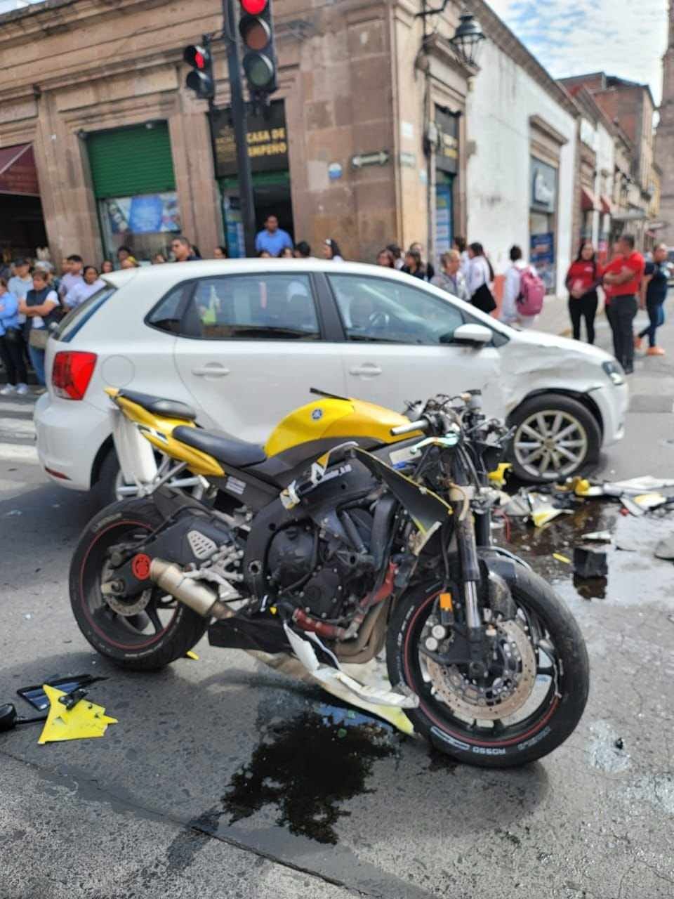 Uno de los percances ocurrió sobre la avenida Francisco I. Madero esquina con Belisario Domínguez, en pleno Centro Histórico. Se trató de un aparatoso choque entre una moto amarilla y un auto blanco. El piloto del motociclo quedó herido y fue atendido por paramédicos.