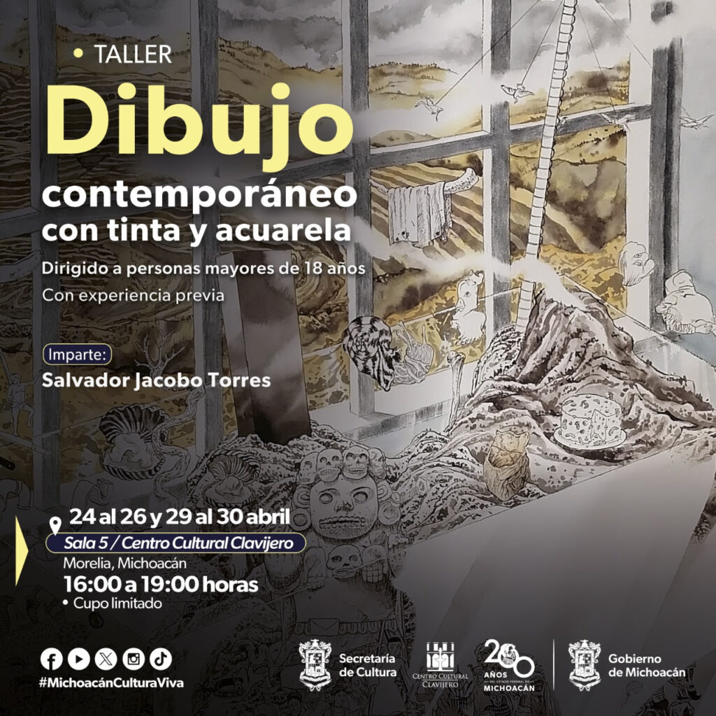 Si tienes más de 18 años y te gusta dibujar, la Secretaría de Cultura de Michoacán te invita a tomar el taller gratuito de dibujo contemporáneo con tinta y acuarela, que estará a cargo del artista Salvador Jacobo, los días 24, 25, 26, 29 y 30 de abril, de 16:00 a 19:00 horas en la Sala 5 del Centro Cultural Clavijero.