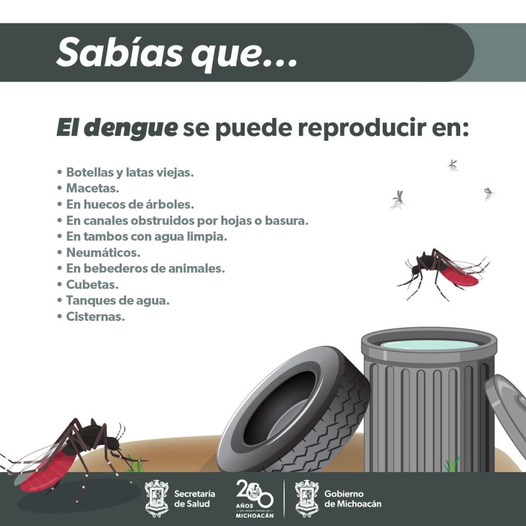 Por ello, la Secretaría de Salud de Michoacán (SSM) trabaja de la mano con la población a través de la estrategia patios limpios que consiste en lava, tapa, voltea y tira botes, botellas, llantas, cubetas, pilas, piletas y todo aquello que acumule agua y se convierte un criadero del vector.