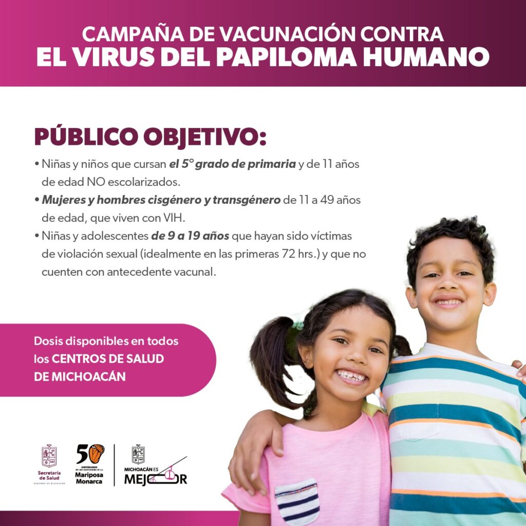 La Secretaría de Salud de Michoacán (SSM) anuncia la ampliación de la campaña de vacunación contra el virus del papiloma humano (VPH) para niñas y niños de quinto grado de primaria y de 11 años no escolarizados.
