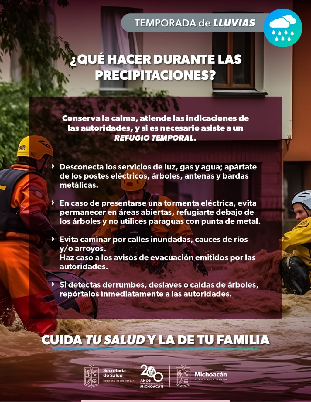 Ante la temporada de lluvias, la Secretaría de Salud de Michoacán (SSM) emite las siguientes recomendaciones a la población.