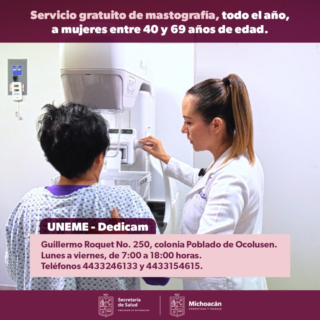 La Unidad de Especialidades Médicas para la detección de Cáncer de Mama (Uneme Dedicam) de la Secretaría de Salud de Michoacán (SSM) refuerza las acciones de detección temprana y oportuna del cáncer.