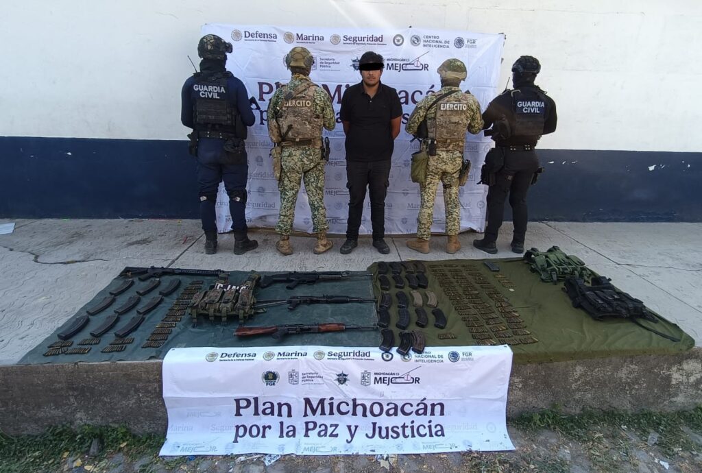 Apatzingán, Michoacán, 20 de febrero de 2026.- Como parte del reforzamiento del Plan Paricutín en Apatzingán, elementos de las secretarías de Seguridad Pública (SSP) y de la Defensa Nacional (Defensa) detuvieron a un hombre en posesión de cuatro fusiles, 714 cartuchos útiles, 29 cargadores, chalecos tácticos y un vehículo con reporte de robo.