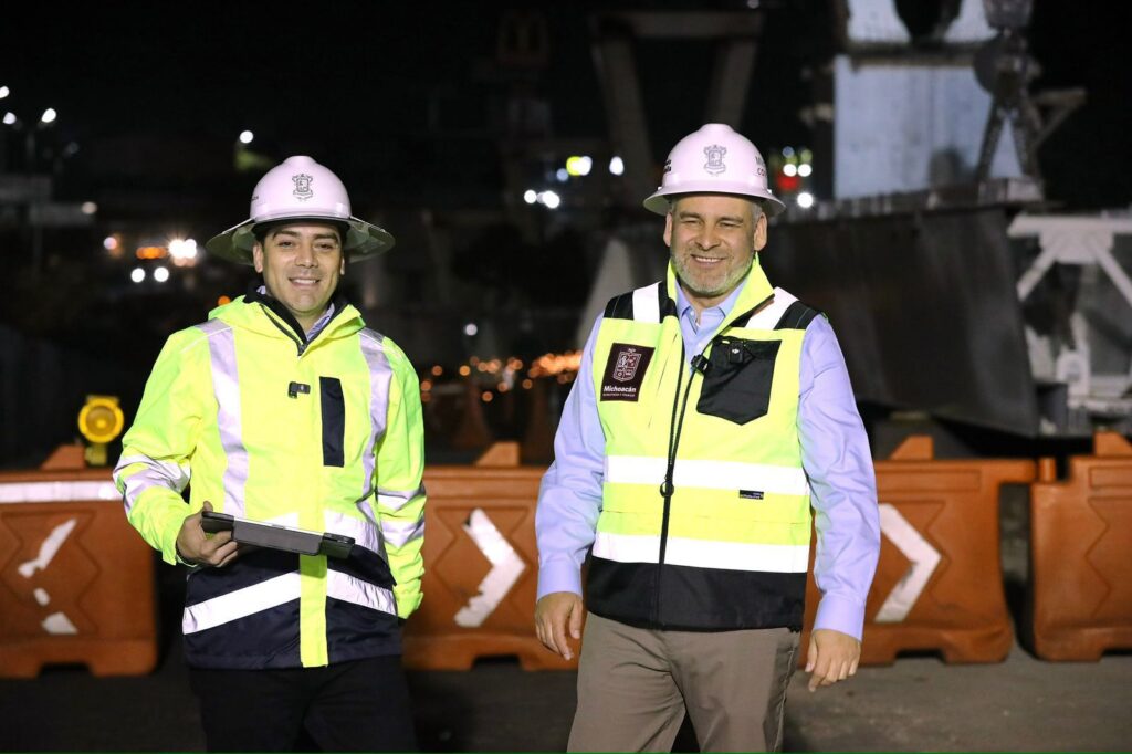 El gobernador Alfredo Ramírez y el secretario de Comunicaciones y Obras Públicas, Rogelio Zarazúa Sánchez, supervisaron la instalación de la segunda trabe de nueve en total que integrarán el puente Periférico-Calzada La Huerta, del distribuidor vial de la salida a Pátzcuaro.