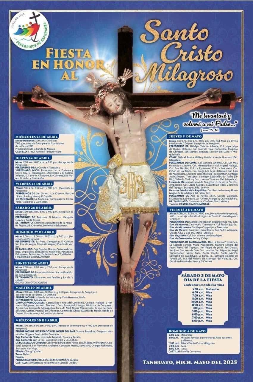 Morelia, Michoacán, 22 de abril de 2025.- La Fiesta en honor al Santo Cristo Milagroso de Tanhuato está lista para realizarse este 2025, del 23 de abril al 4 de mayo, informó la Secretaría de Turismo de Michoacán (Sectur), que encabeza Roberto Monroy García.