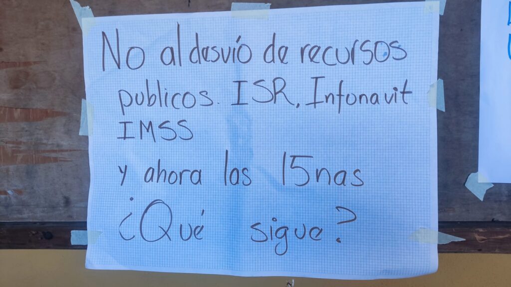Señalaron que no sólo es el adeudo del pago a la quincena ya devengada, también existen adeudos al pago de prestaciones como Impuesto Sobre la Renta (ISR) de abril de 2024 a la fecha, cuota social, cesantía y vejez desde 2021 a la fecha, así como el pago de ahorro para la vivienda (Infonavit) del último bimestre de 2025.