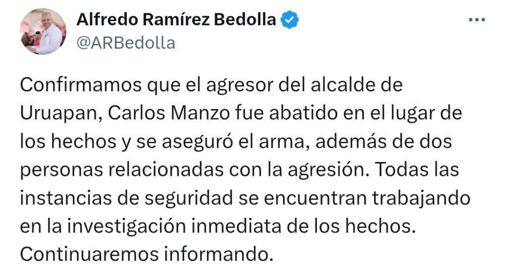 El gobernador Alfredo Ramírez Bedolla condenó enérgicamente el cobarde atentado en el que perdió la vida el alcalde de Uruapan, Carlos Manzo, por el cual, ya se encuentran dos personas detenidas y una más fue abatida.